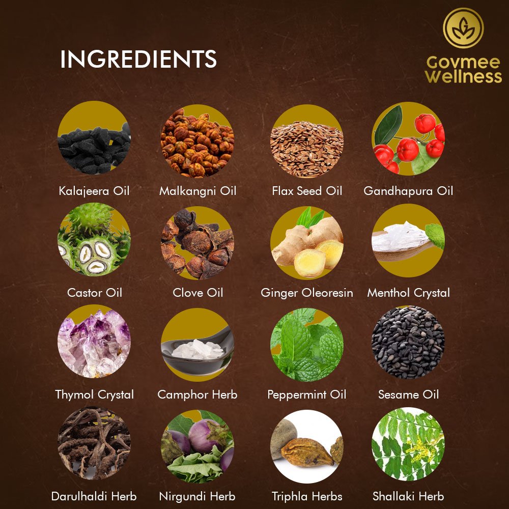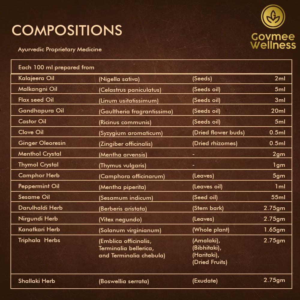 Pain Oil (Type ) : | 100% Ayurvedic Pain Oil (Medicine) | Ingredients : | Oil:- Malkangni, Kalajeera, Flax Seed, Gandhapura, Castor, Clove, Peppermint, Ginger Oleoresin, Sesame Oil. Herbs:- Darulhaldi, Nirgundi, Kanatkari, Triphala, Shallaki, Camphor, Thymol Crystal, Menthol Crystal. |