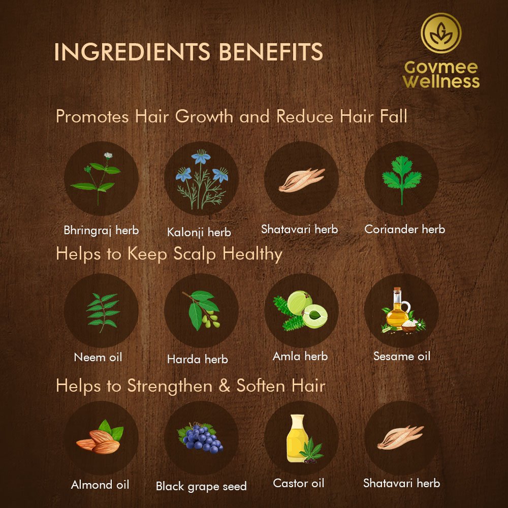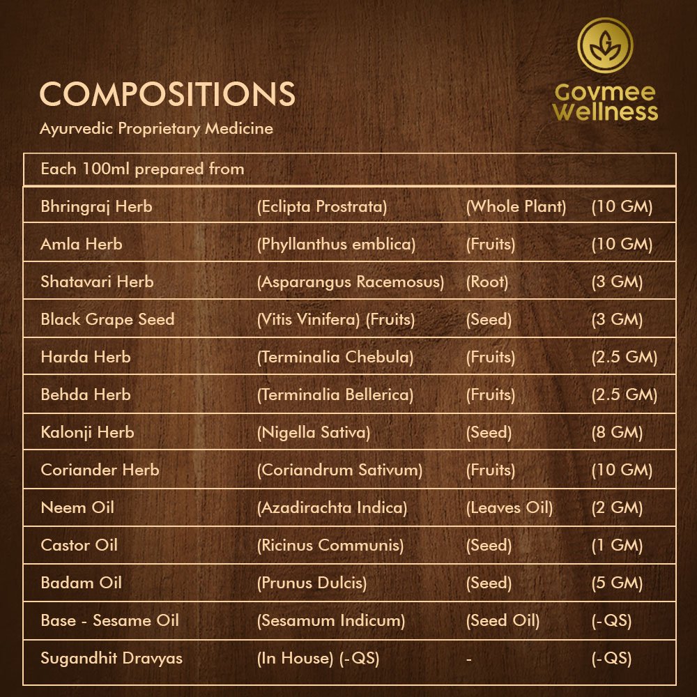 Ingredients : | Oil:- Sesame, Badam, Castor, Neem Oil. Herbs:- Bhringraj, Amla, Shatavari, Black Grape Seed, Harada, Behda, Kalonji, Coriander herbs. |